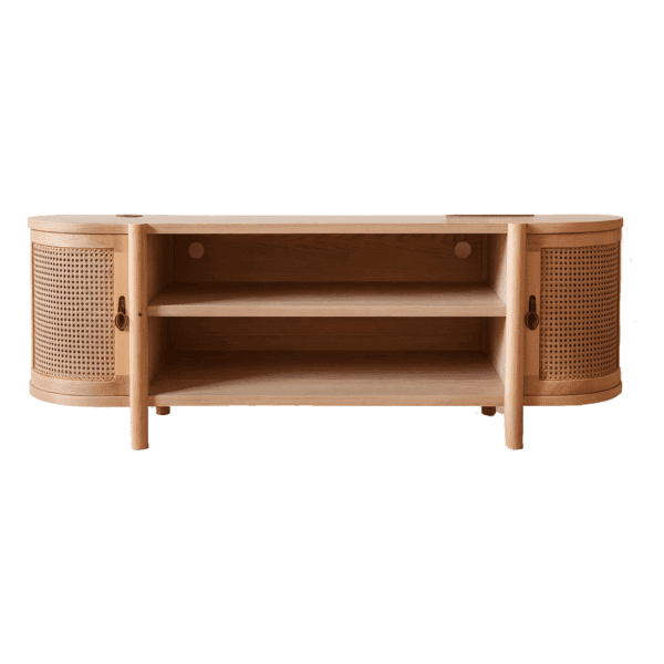 The TV unit showcases a minimalist design, with clean lines and a focus on functionality. The sides of the unit are adorned with cane detailing, adding a touch of texture and visual interest. This charming combination of light wood and cane creates a stylish and inviting look that complements a variety of interior styles.