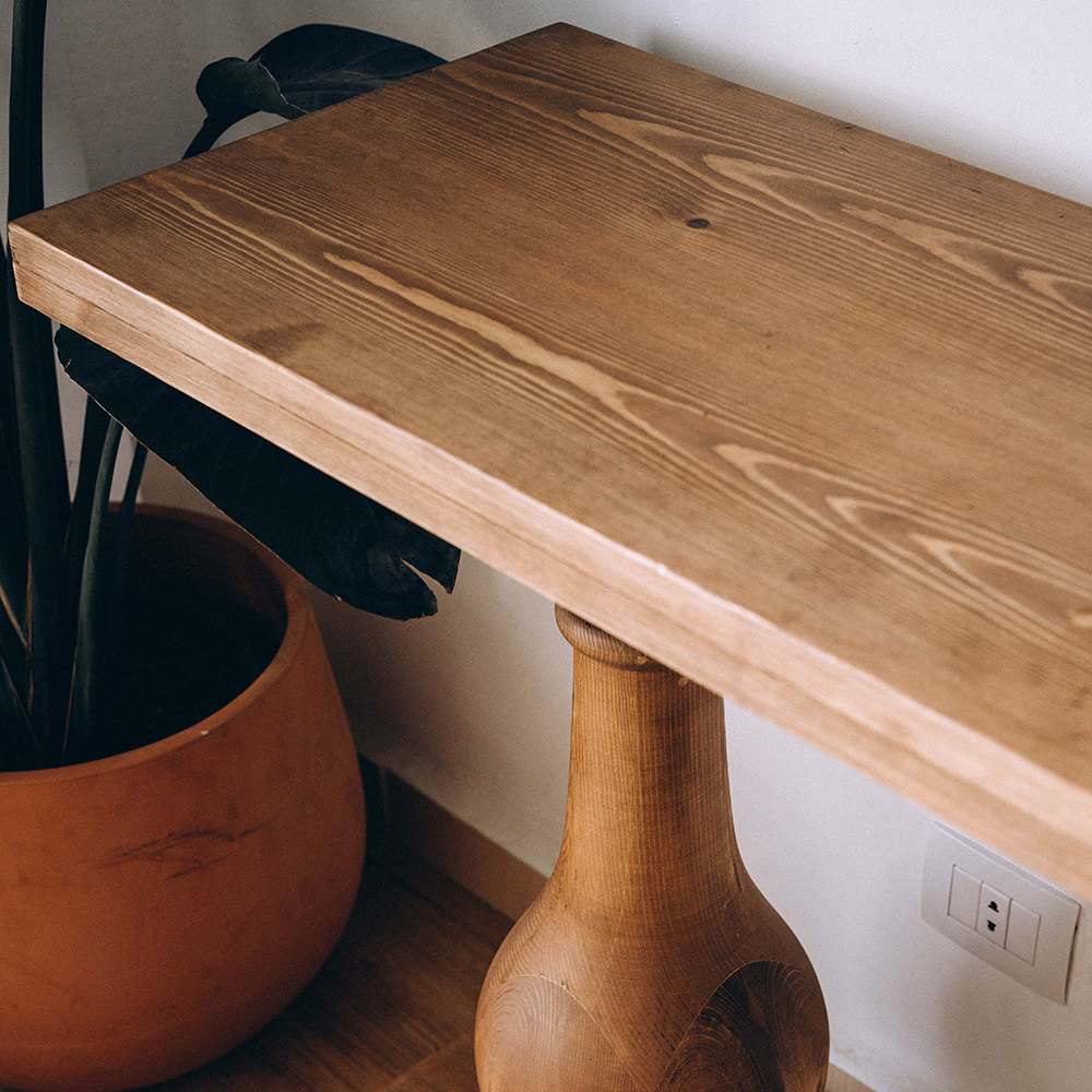 It’s made from pine wood and features a rustic light brown stain finish, the antiqued look is tempered with two carefully curved legs.