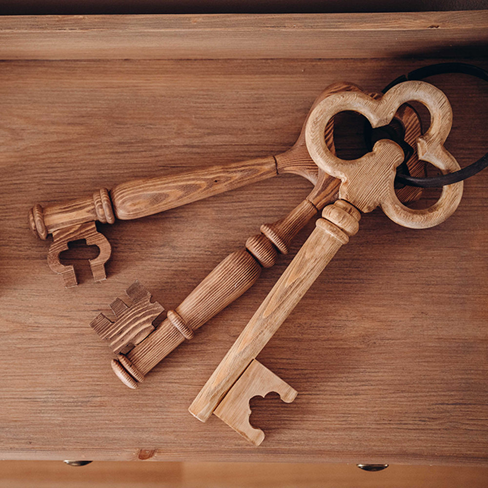 CUEÂ a set of three vintage keys made from exquisite moski wood. Each key in this set exudes a charming and rustic appeal, perfect for adding a touch of nostalgia to your decor or as a unique gift for any key enthusiast. Here is a detailed description of the set
