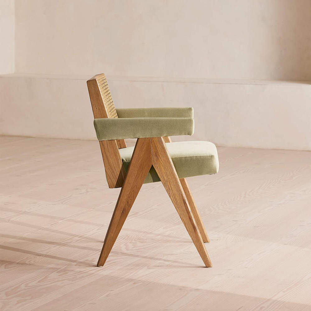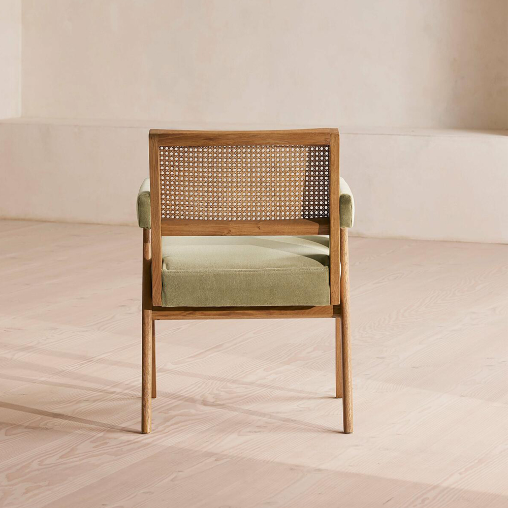 Elaf Chair, a perfect blend of classic design and modern comfort. Featuring a beautifully crafted cane backrest and a plush green seat fabric, this chair adds a touch of elegance to any dining or living space.