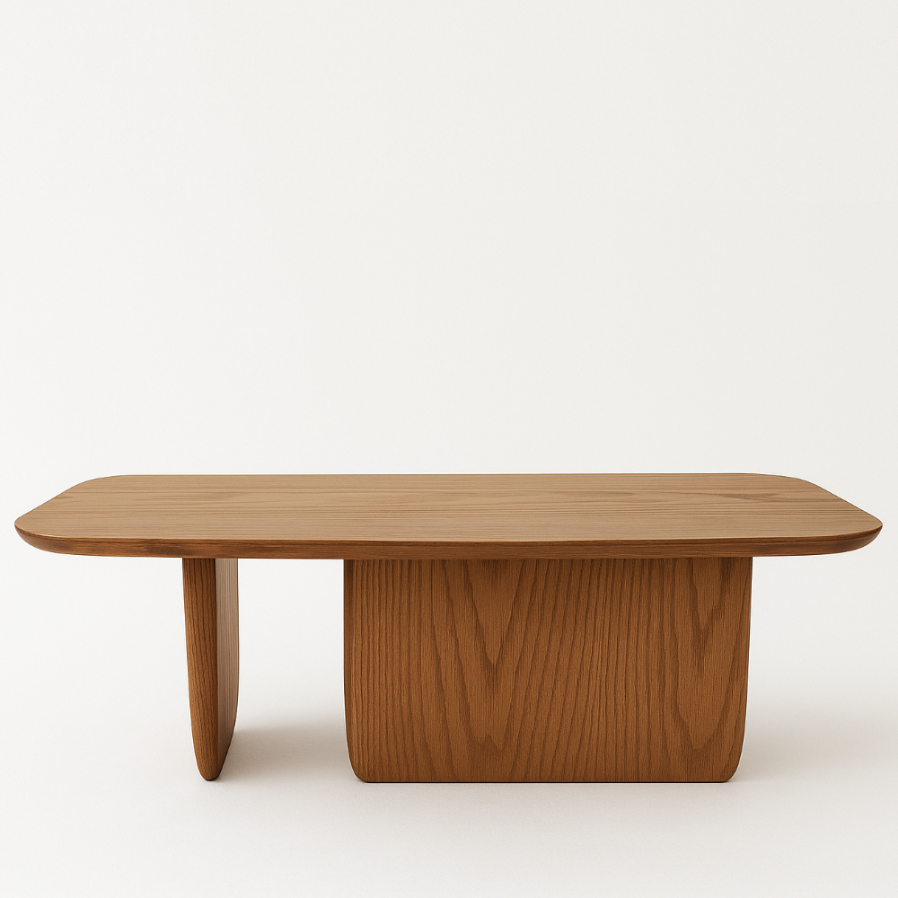 Flow coffee table A modern statement piece, this handcrafted wooden coffee table blends functionality with timeless design. Its smooth rectangular top with softly rounded edges rests on bold asymmetrical legs, creating a sculptural silhouette that stands out in any living space. The natural wood grain adds warmth and character, making each table unique.