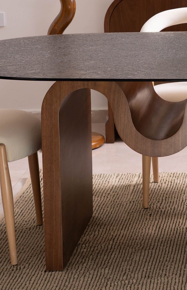 The Flowy Dining Table features a fluid, wave-inspired base that brings softness and rhythm into the space. Topped with a textured bronze glass surface, it creates a rich contrast between solid form and a warm, reflective finish.