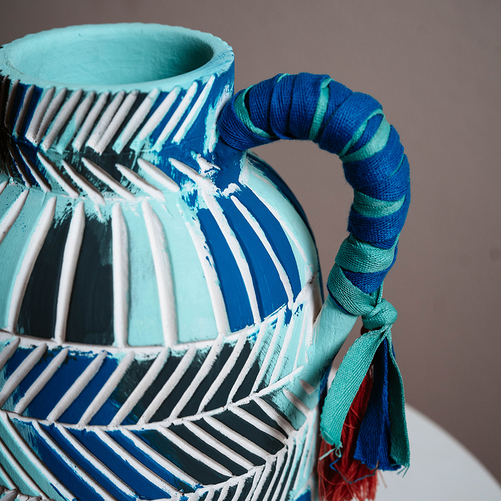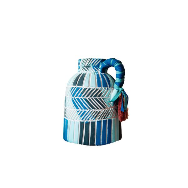 Place it on your mantel, shelf, or dining table to instantly uplift the ambiance with its cheerful presence. Fill it with your favorite summer blooms or let it stand alone as a stunning work of art. Handmade from pottery and adorned with hand-painted shades of blue stripes, complemented by high-quality tassels in blue and dark red threads cascading from its handle, creating a unique and captivating masterpiece.
