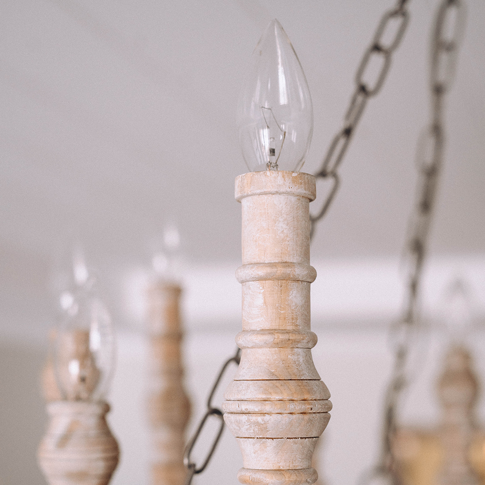 Update your living space with the distinctive, eye- catching style of Lush chandelier. The design features a distressed wooden frame that’s accented by neutral and white finish with 12 lights.