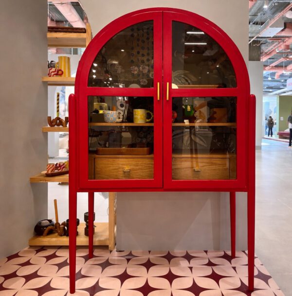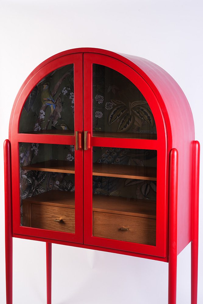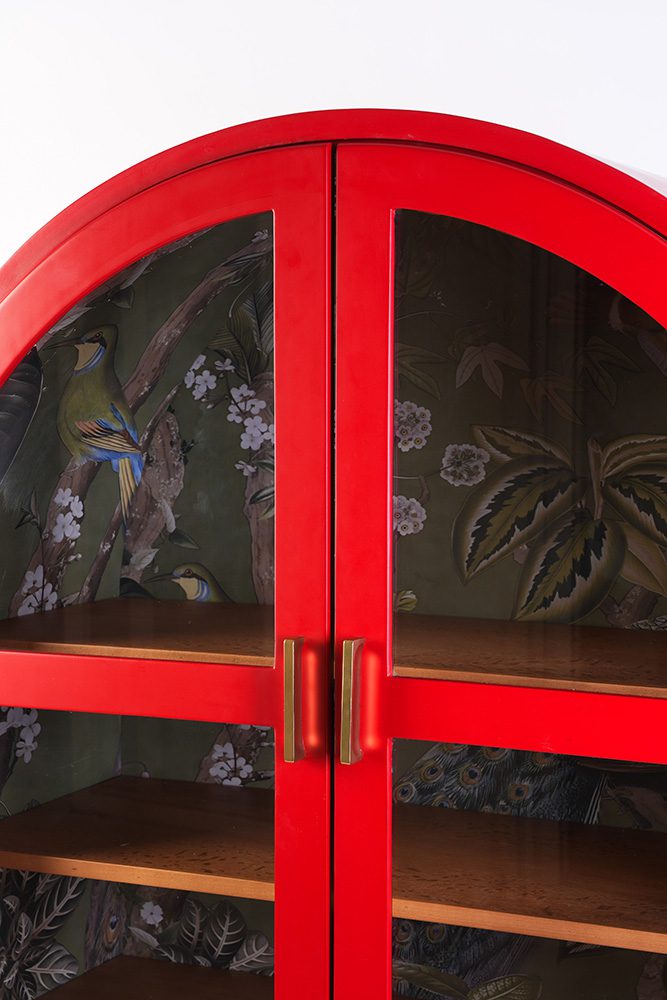 The Queen B Cabinet is a bold display cabinet designed to stand out. With its arched shape and vibrant red finish, it instantly becomes the focal point of any space.