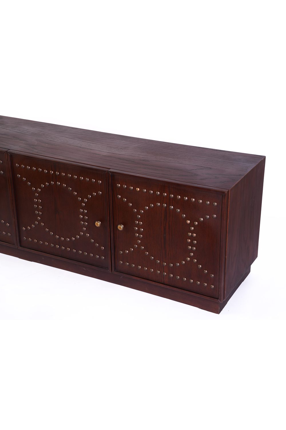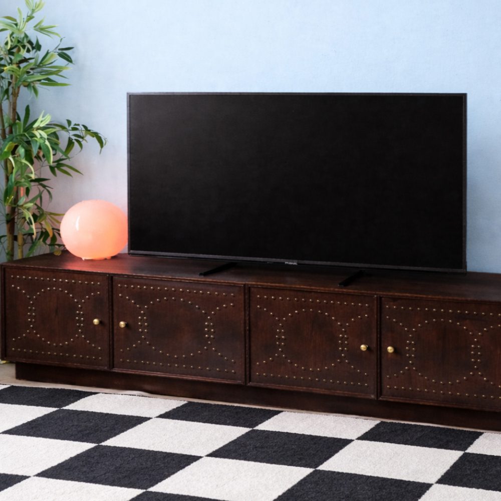 The Rivet TV Unit is a wooden TV console defined by its patterned metal rivets, adding texture and character to a clean, structured form. The rich wood finish brings warmth, while the studded detailing creates a subtle statement without overwhelming the space.