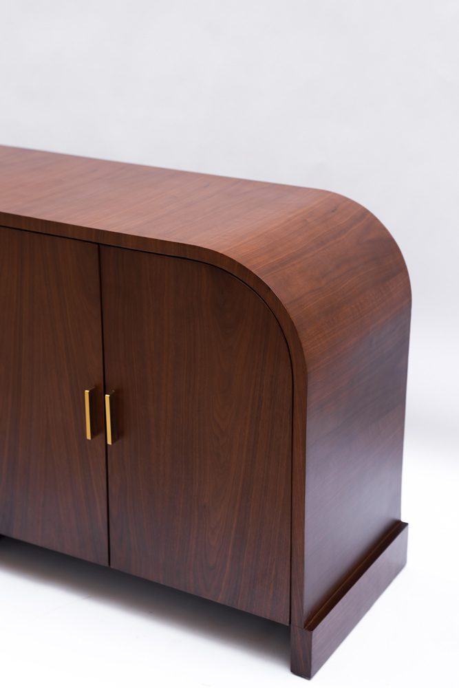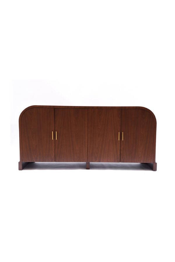 The Sleek Buffet features a streamlined form with softened edges and a rich wood finish, bringing natural warmth and depth into your interior. Its clean front, accented with subtle brass handles, keeps the look refined while offering practical, concealed storage.
