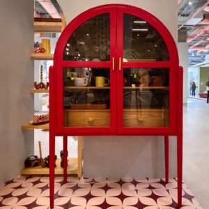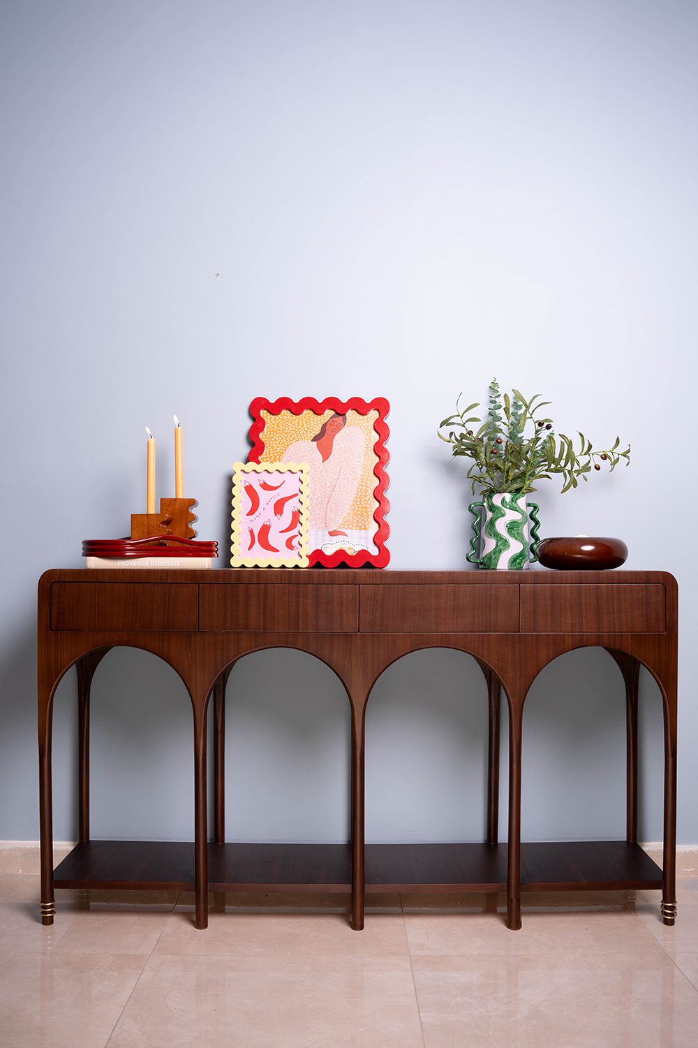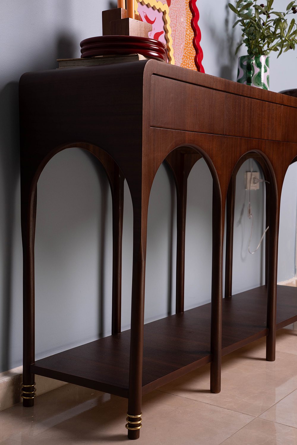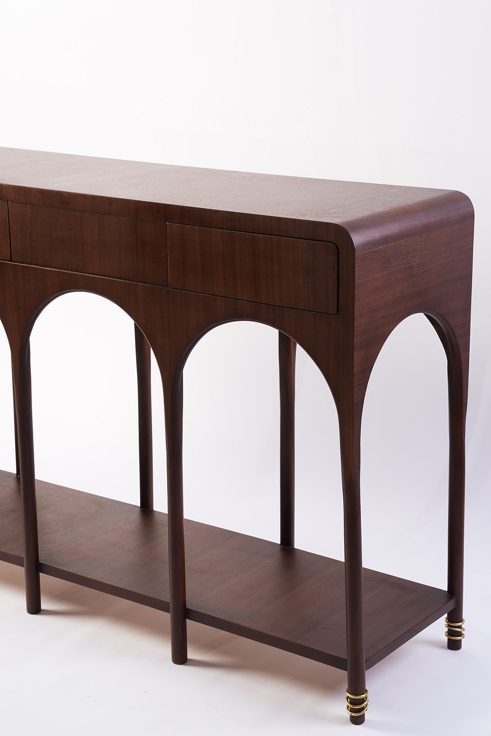 The Away Console Table is a refined wooden console table designed with soft arches and a balanced structure. Its open base adds lightness, while the top features push-to-open drawers for seamless, handle-free storage.