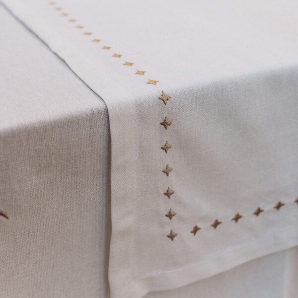 Set the perfect scene for your Ramadan gatherings with the Widad Tablecloth, crafted from luxurious offwhite linen and adorned with elegant crescent and star embroidery in mocha-colored threads. Designed to bring warmth and sophistication to your dining space, this tablecloth is the perfect foundation for memorable Iftar and Suhoor moments.
