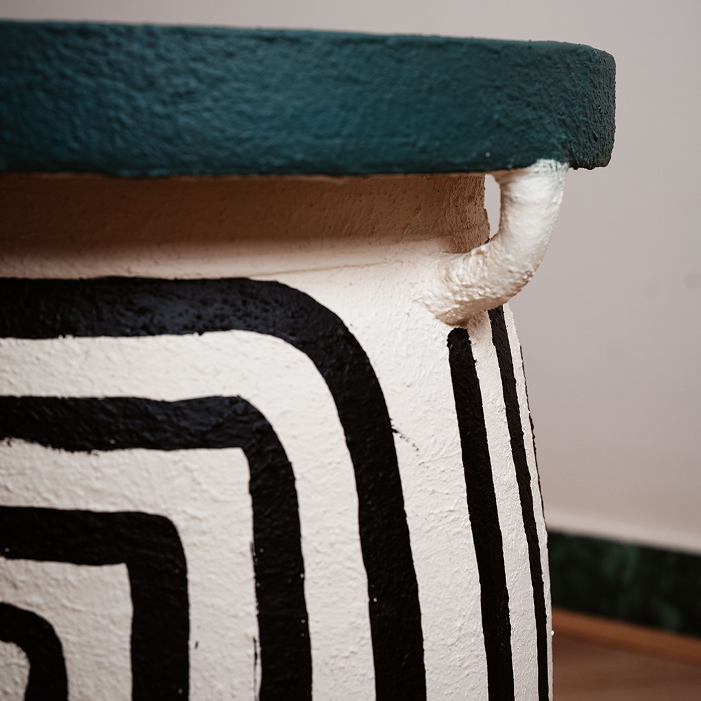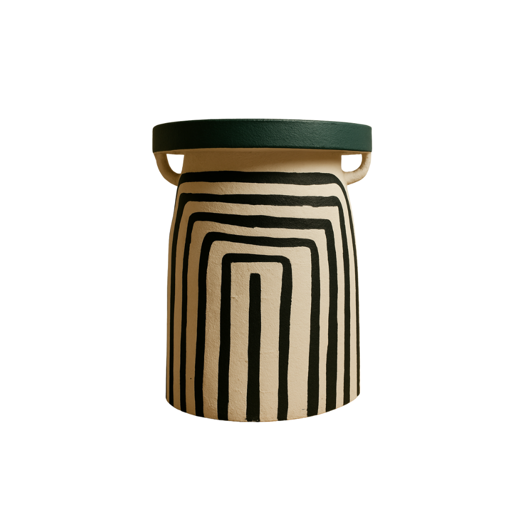 A captivating piece that combines the beauty of pottery craftsmanship with a modern design. With its black base and off-white body, and deep green top, this side table exudes a unique and sophisticated charm. Here is a detailed description of this stunning piece.