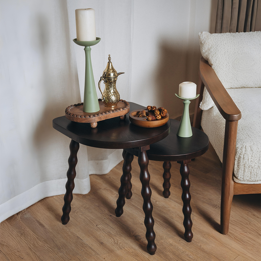 Elevate your space with The Wavy Baraka Tables, a sophisticated duo crafted from premium beech wood. Designed to bring warmth and depth to any room, these tables feature elegantly sculpted legs that add a dynamic, organic touch to their timeless silhouette. Perfect for modern,